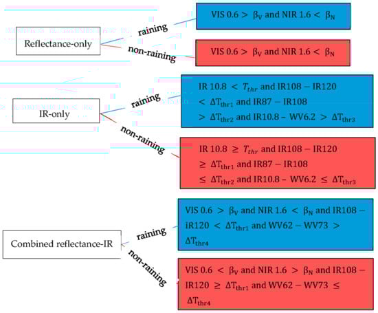 Examples of the dichotomous statement for each category of the rain detection model. The and are the thresholds for VIS0.6 and NIR1.6 reflectance, respectively, is the threshold for IR10.8 BT, , , , and are the thresholds for IR10.8–IR12.0, IR8.7–IR10.8, IR10.8–WV6.2 and WV6.2–WV7.3 BTD, respectively.