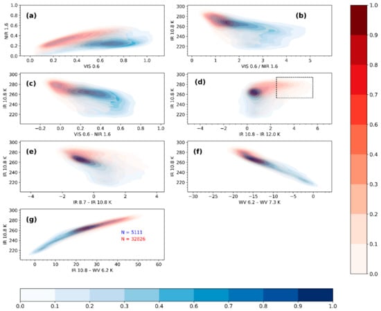 Bivariate probability density distribution of daytime raining (blue) and non-raining (red) spectral characteristics in (a) VIS0.6 and NIR1.6, (b) IR10.8 and VIS0.6 ÷ NIR1.6, (c) IR10.8 and VIS0.6–NIR1.6, (d) IR10.8 and IR10.8–IR12.0, (e) IR10.8 and IR8.7–IR10.8, (f) IR10.8 and WV6.2–WV7.3, (g) IR10.8 and WV6.2–IR10.8 space. The coloured figures in (g) are the raining and non-raining data counts, respectively, that computed the density distribution. The colour bar shows normalised densities to make the subfigures comparable with one another.
