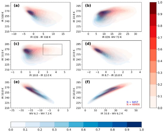 Bivariate probability density distribution of nighttime raining (blue) and non-raining (red) spectral characteristics in (a) IR10.8 and IR3.9–IR10.8, (b) IR10.8 and IR3.9–WV7.3, (c) IR10.8 and IR10.8–IR12.0, (d) IR10.8 and IR8.7–IR10.8, (e) IR10.8 and WV6.2–WV7.3, (f) IR10.8 and WV6.2–IR10.8 space. The coloured figures in (f) are the raining and non-raining data counts, respectively, that computed the density distribution. The colour bar shows normalised densities to make the subfigures comparable with one another.