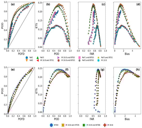 The nighttime results (Figure 5e–h), the ROC curves (Figure 5e) show that threshold values corresponding to BTD4 have the largest distance from the diagonal line, suggesting the best model performance. On the other hand, rain detection models developed from IR (IR10.8) BT and BTD usually resulted in medium model performance. In contrast, those based on a single IR BT often showed poor performance.
