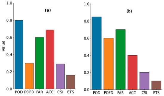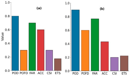 In Table 6, different categorical statistics were computed for each threshold value based on the contingency table elements. Each statistical parameter evaluates an aspect of the model performance. Collectively, they were used to find the threshold value that provides optimal model performance in rainfall detection. A detailed description of each statistical parameter can be found in, e.g., [,].