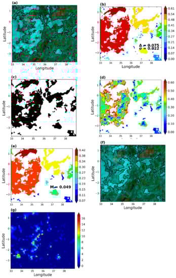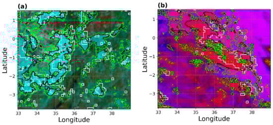 In this study, original reflectance, brightness temperature (BT) and brightness temperature differences (BTD) of the MSG satellite were used to infer cloud top properties [,,] that detected raining areas under day and night conditions. Different combinations of the satellite channels were used for rain detection during the day and night periods because the MSG VIS0.6 and NIR1.6 µm channels are not available at night. Also, the use of IR3.9 µm during the day and twilight times is discouraged due to solar and thermal contributions and varying solar components in this channel [,]. The daytime and nighttime periods were from 04:15 AM to 3:15 PM and 4:15 PM to 03:15 AM UTC, respectively, excluding twilight periods between 03:30 AM and 04:00 AM and 3:30 PM and 4:00 PM UTC. The European Organization for the Exploitation of Meteorological Satellites (EUMETSAT) operational cloud mask product [] was used to identify cloudy pixels to ensure that only satellite data from cloudy scenes were used in this study.