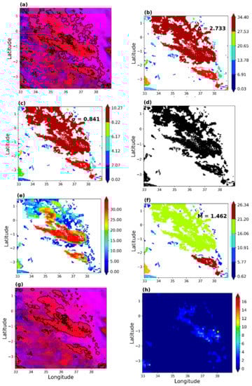 The BTD between IR10.8 and WV6.2 µm have been previously used for cloud classification [,] and rainfall detection []. In the latter, clouds with BTD < 11 K for IR10.8–WV6.2 (an empirically determined threshold) were classified as raining.