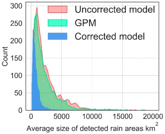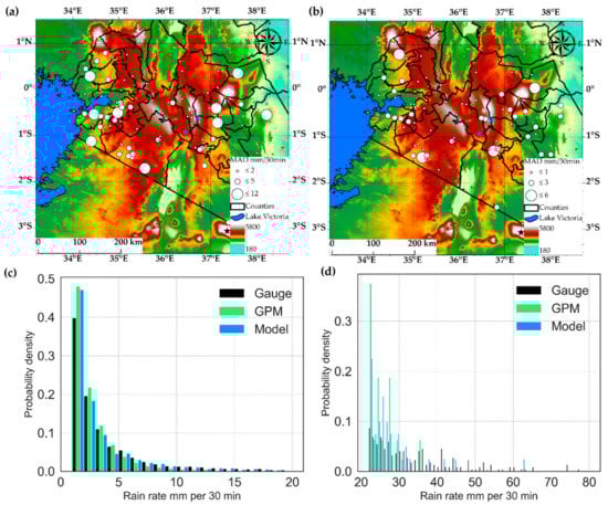 For the comparison with GPM IMERG, the model detected rain areas (that were corrected using the next section’s method) and rain rates were compared to the results from the latest IMERG Final Run version 6 (V06b) [] because it is the latest improvement in the GPM IMERG satellite precipitation product. The focus was on the precipitationCal dataset because it is a research-grade product that is climatologically adjusted using ground data from the GPCC. Although recent studies see, e.g., [,,] have ground validated and reported this new IMERG rainfall product’s performance elsewhere, its performance over gauge scare areas like the study area is generally not yet reported []. Therefore, this comparison intends to spatially validate the newly developed parametric model’s rain area and rate detection skill against the new IMERG V06b precipitationCal rainfall product.