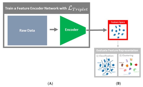 Methodology schemes of (A) training a feature representation with the triplet loss and (B) evaluating the learned feature representation (classification and clustering) with respect to the objectives of achieving invariance to novel operating conditions and sensitivity to novel faults.