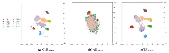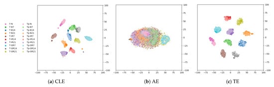 Case Study 1: t-SNE plot of feature space on of the classifier encoder (CLE), the Autoencoder (AE), and the Triplet Encoder (TE).