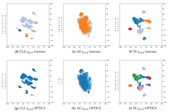 In Figure 3, the feature space is depicted for for sample selection 1 () and the models sharing the same encoder architecture (AE, classifier encoder, triplet encoder). The true labels as well as the predicted cluster class of the two methods (OPTICS and k-means) is displayed.
