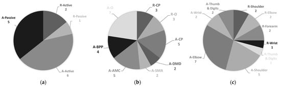 | MyoPal | Assistance | Active–Electric | EMG, Position | BPP, CP, Other | 2 | Elbow–FE Thumb and Digits–FE | Myomo [67] |
