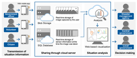 The proposed streamline using a smartphone application is shown in Figure 2. It basically describes data flows, including data collection, data sharing, data analysis, web-based visualization, and information delivery to decision makers. Data can be collected by public officials who check and investigate the site when an incident occurs, volunteers who report emergency situations and support rescue activities, and citizens in the vicinity of the emergency situation. When a user notices a serious situation and takes images of a dangerous spot using the developed app, those images along with the smartphone sensor data are transmitted to the cloud server automatically. As the app is developed for easy operation, it can be readily used by the private sector, such as local residents, as well as public officials who are responsible for reporting and recording the situation at the disaster site.
