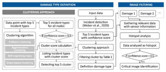 In social media, as many users share images and textual information about a given incident site in real time over various regions, it is possible to acquire an overwhelming amount of data compared to other means. Thus, existing studies focus on developing algorithms for classifying disaster-related data and filtering unnecessary data. Recently, deep learning-based computer vision methodologies have been expanding into various fields with excellent performance. However, most machine-learning technologies are limited in their ability to precisely detect and filter related images representing real-time situations and damage [7]. In addition, disaster sites can be described in different ways depending on the magnitude of the damage, regional characteristics, and weather conditions; moreover, in the case of multiple types of damage, it can be difficult to clearly classify a site using simple classes. To address this uncertainty, an incident type is defined using images collected for a set area, and a process of filtering data using spatial analysis according to each type of incident is proposed, as shown in Figure 3. Contents on data filtering using spatial analysis are described in Section 3.4.