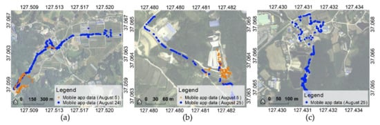 Smartphone application data acquired from study area: (a) Yul, (b) Iljuk, and (c) Juksan. The coordinates refer to WGS84 (EPSG: 4326).