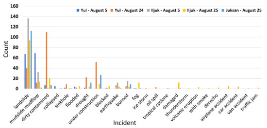 Comparing according to the clustering method, flooded was not detected when K-means and agglomerative clustering algorithms were applied to Yul data on 5 August. For Yul on 24 August, Mudslide mudflow was not detected only when K-means clustering was applied. Incident types that vary depending on the clustering method can be said to be a type related to the field situation, although it is ambiguous to be considered as the main type. Except for these two cases, the same incident types were detected, and analysis was performed on all finally detected types.