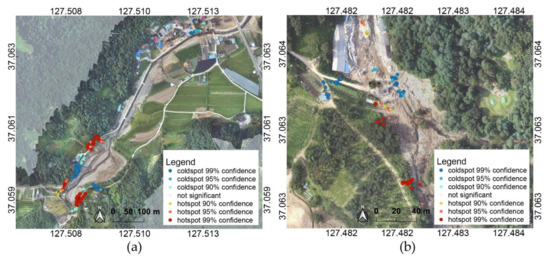 Hotspot analysis on landslide incident using 5 August data: (a) Yul and (b) Iljuk. The coordinates refer to WGS84 (EPSG: 4326).