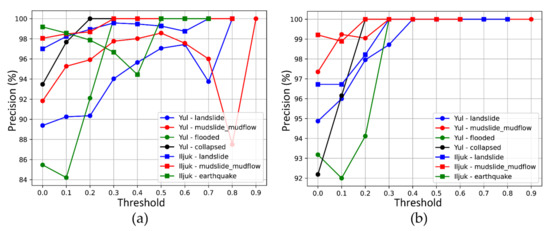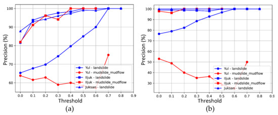 For the 24–25 August dataset, the precision tends to increase in a relatively stable manner as the threshold changes, except for the mudslide mudflow in the Yul region. Restoration was in progress at the time the data were collected, and a high confidence score was detected for some disorganized dirt piles. Except for this case, the confidence score-based image classification appears to be significant for analysis of the 5 August dataset. Using hotspot analysis, the classification precision was improved by up to 11.77% in the landslide case in Yul, but decreased by 29.76% in the mudslide mudflow case in Yul.