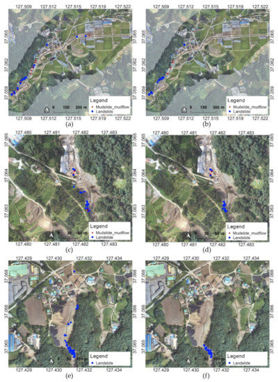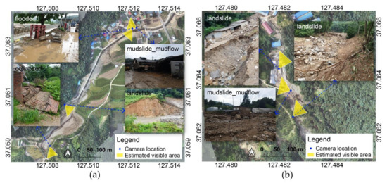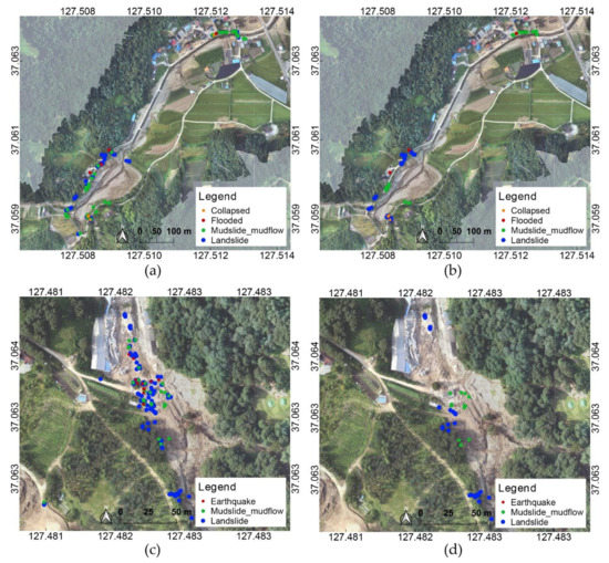 The distributions of the data collected on 5 August and that collected on 24–25 August are different, but similar results were shown for major damaged areas. For data collected on 5 August and 24–25 August, there are differences in some types of incident such as collapsed, flooded, and earthquake because there are differences in the data collection environment and distribution of the collected data. However, for the critical incident types of landslide and mudslide mudflows, the damage locations were estimated in a similar manner. In addition, these results showed similar patterns when compared with the UAV orthoimages.