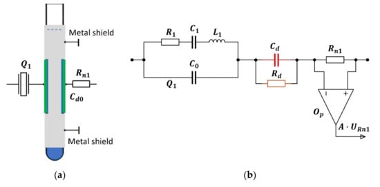 The substitute scheme for the experimental setup consisting of a glass test tube with a capacitor connected in series with a quartz crystal and resistance, , is shown in Figure 1b, where the left part of the scheme shows an equivalent electrical circuit of the quartz crystal. The capacitor with capacitance represents the empty glass test tube, while and are the capacitance and resistance of the test tube filled with the measured liquid, respectively. The resistor with resistance and operational amplifier are intended for the measurement of the conductance of the liquid under test at the frequency at which the quartz oscillator oscillates.