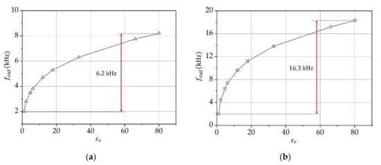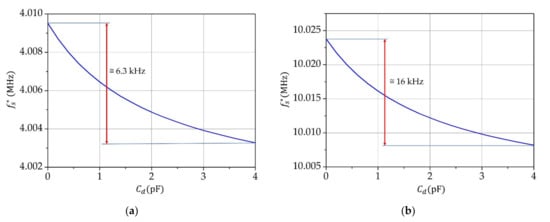 Equation (9) reflects the change of frequency within the range of variation of capacitance . Figure 2a,b illustrate the changes of the resonant frequency (Equation (9)) for and quartz crystals. A crystal displays an approximately times higher frequency sensitivity than the crystal at the same change of capacitance .