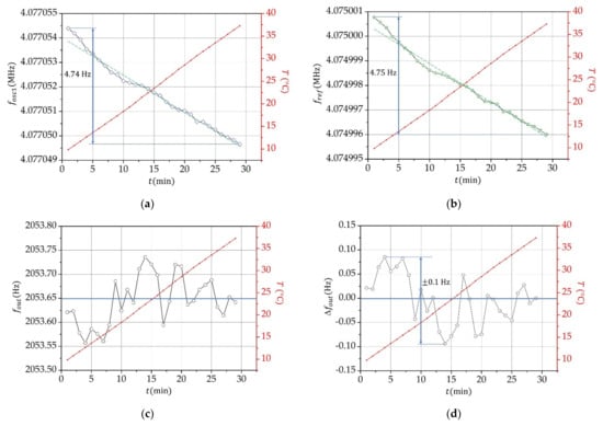 Oscillator’s frequency variation in relation to the temperature variation (10–40 °C). The temperature was increased uniformly from 10–40 °C in a time span of 30 min (red dashed line). (a,b) Variation of the oscillator frequencies and . The green dashed line presents the trend. (c) Frequency difference, , between the two oscillators. (d) Variation of the frequency difference, , between both oscillators in relation to the mean value of 2053.65 Hz (blue line in Figure 3c).