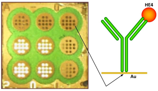 SPRI measurements were performed as previously described [14,20]. A home-made apparatus and chip architecture were used, as described in Appendix A.2. The chip architecture and a sketch of the biosensor are shown in Figure 1. The SPRi signal was measured twice, after the immobilization of the antibody and then after interaction with a solution containing HE4 at a constant light angle. A 3 μL plasma sample or a standard solution of HE4 was placed on an immunosensor for 10 min and then washed with an HBS-ES buffer and water. The buffer and water were removed from the chip surface by means of a vacuum.