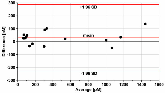 The validation of the developed biosensor was performed by the parallel determination of HE4 by the developed biosensor and a standard method in a series of blood serum samples from patients with ovarian cancer. The standard method was the Elecsys HE4 electrochemiluminescence performed on COBAS E-411. The results showed an acceptable correlation (a Pearson coefficient of 0.989). For a better comparison of the results of both methods, a Bland–Altman plot was made (Figure 4).