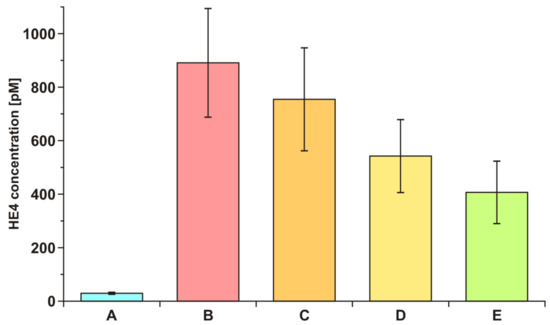 To demonstrate the diagnostic effectiveness of the developed biosensor, the HE4 concentration in the blood serum of ovarian cancer patients before and after tumor resection was investigated. Serum from seven patients was tested for HE4 concentration before resection and after 6 h, 24 h, and 5 days after resection. Average values are shown in Figure 5. The average value of HE4 concentration in blood serum is included for comparison.