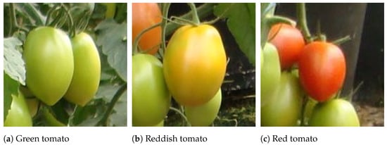 The development of harvesting robots to work in greenhouses is always challenging because robots have to work in unstructured environments and perform uncertain tasks. In the case of harvesting tomato, the sensing mechanism has to detect fruit in the presence of various disturbances in an unpredicted heterogeneous environment included different arrangements of plant sizes and shapes, stems, branches, leaves, variable colour, under leaves, sun glare and variable light conditions [,]. Even more, as a climacteric fruit, according to the technological objectives, the tomato can be harvested at the physiological maturity phase (green colour), completing the ripening after harvest, or it can be harvested later at different stages of ripening in which it already has a reddish colour []. When to harvest will depend on how the tomato will be handled and used. Fresh market fruit for local consumers can be picked red, while fruit that will be transported long distances should be harvested at early maturation with green colour (Figure 1).