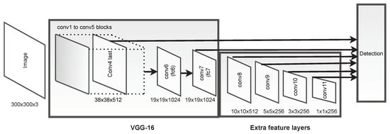 The SSD architecture, depicted in Figure 2, is composed of two main parts: feature extraction and object detection. For the first one, a state-of-the-art classification model is usually used (e.g., the VGG16 [] network as in Figure 2), but others like ResNet [] or MobileNet [] are also possible. The feature extractor is called the backbone, and its purpose is to generate high-level feature maps from the input image. Besides the backbone, the SSD adds six extra feature maps with a decreasing spatial dimension; see Figure 2 [,].