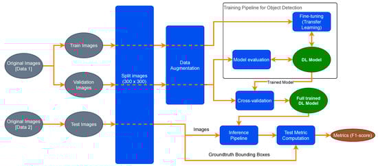 Most DL models are known as supervised ML algorithms. This specificity implies that the training mechanisms for DL models need to be fed with an annotated dataset. In the case of object detection, each annotation identifies its class, size and position. Some annotation types, like the Pascal VOC format, also include some additional features of the annotations as whether the target object is difficult to detect, occluded or truncated. For the current dataset, we used the Pascal VOC format, as used in the Pascal VOC Challenge [], due to its simplicity, resuming the annotations for each image in a single XML file. In this case, we ignored the additional features because the TensorFlow1 Object Detection Pipeline ignores these features.