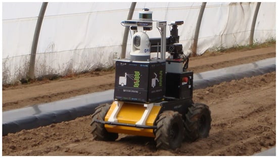 The mobile robot AgRob v16 (Figure 6) was used for recording images inside the greenhouses to increase the representativeness of the data. This robot is equipped with a set of sensors commonly used in robotic operations. Therefore, we obtained data acquired in the same conditions as a robot in a regular harvesting operation. At this stage, a human operator controlled, slowly, the robot through the different halls of the greenhouses, while the robot recorded, into a single ROSBag file, the information provided by its different sensors (cameras, IMU, LiDAR, among others). For the purposes of this study, only RGB images were relevant. The robot was moved along the crop row, keeping a distance between the robot and tomato plants from 0.4 to 0.6 .