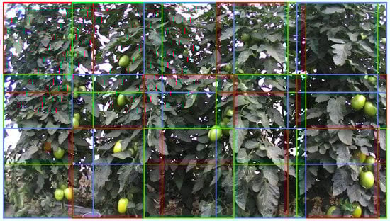 We intended to use TPUs to detect tomatoes online inside the tomatoes’ greenhouses. However, TPUs are not compatible with all the ANN models. At the current time, they are only compatible with SSD models [] and the tiny versions of You Only Look Once (YOLO) [] model. Additionally, these models cannot process full-sized images, rescaling all the images before processing them. For instance, the pre-trained MobileNet v2 [] can only process images of px. Due to this, we split the original images into px images, following the scheme represented in Figure 7, using pascal_voc_tools (see https://github.com/wang-tf/pascal_voc_tools, accessed on 8 September 2021). This splitting scheme considered the construction of sub-images of px with a minimum overlapping ratio of 20% between sequential images. Splitting full-sized images of px to px increased the dataset and the quality of the considered images for training. Therefore, this procedure increased the accuracy of the developed system. The Dataset now had 5365 images.
