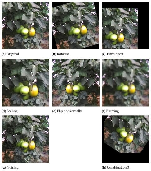 Table 2 resumes the different applied transformations to images and their specifications. All transformations were applied with a random factor, to increase the variability of the data. Figure 8 exemplifies the use of augmentation in images. The augmented dataset resulted in a total of 23,021 images with 61,204 annotations of tomatoes.