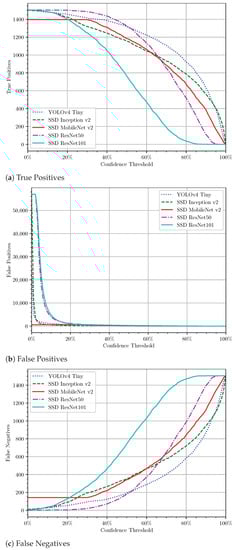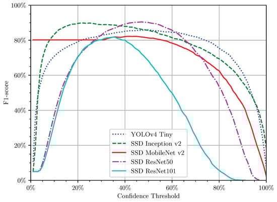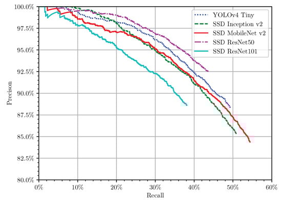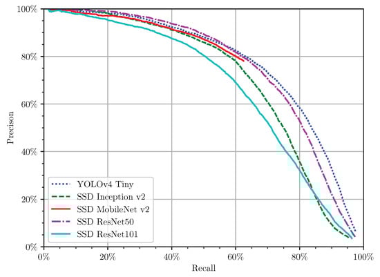 The literature refers to many different evaluation metrics [,]. During the training process, we used the default pipeline metrics. However, as the COCO dataset and OID use different measures to evaluate the performance of the models, an additional common evaluation metrics pipeline was needed. For better benchmark SSD models, we preferred the metrics used by the Pascal VOC challenge [] (precision × recall curve and mean average precision), as implemented by Padilla et al. [], and complemented this evaluation with additional metrics: