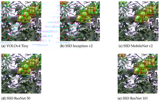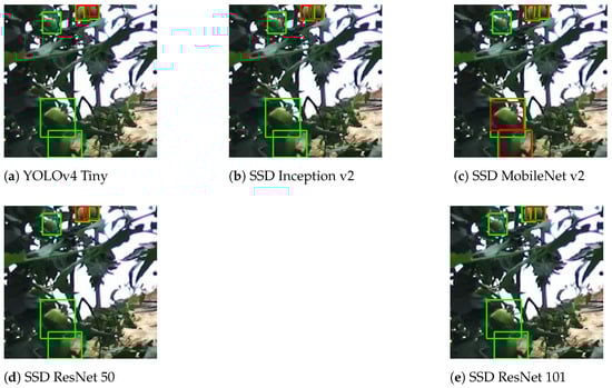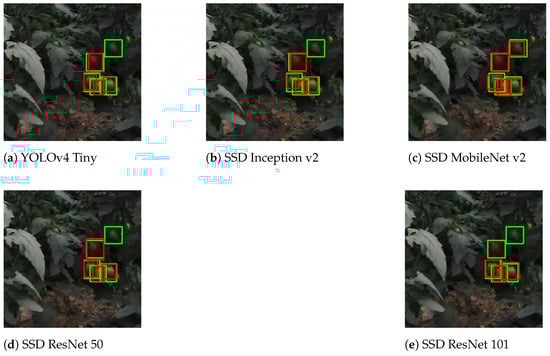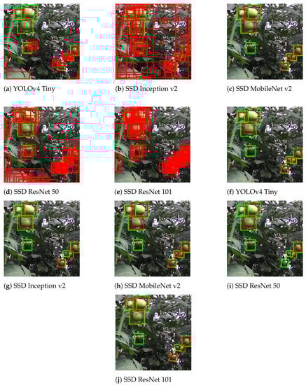 This improvement was demonstrated by de Luna et al. [] who designed a computer visualisation system to evaluate the growth of tomato plants through the detection of fruits and flowers. Two deep learning models were used: R-CNN and SSD. The fruit detection accuracy of the R-CNN model was only 19.48%, while the SSD model showed a much higher detection rate of 95.99%. To detect cherry tomatoes in greenhouses, whether ripe, green or intermediate, Yuan et al. [] developed an SSD-based algorithm. After building the datasets, they were used to train and develop network models. For studying the effect of the base network, one of the experiments was tested on different networks, such as VGG16, MobileNet and Inception V2. The results indicated that the Inception V2 network obtained the best performance with an accuracy of 98.85%.