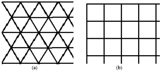 Polygons map: (a) Covering a 2D surface with equilateral triangles; (b) Covering a 2D surface with squares.