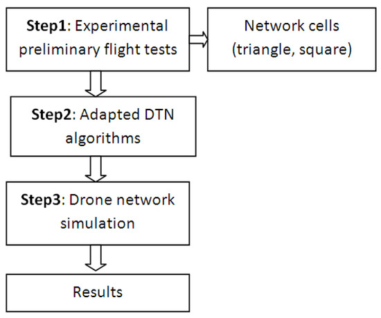A new method for UAV network analysis and evaluation based on experimental preliminary flight tests is proposed, as shown in the flowchart from Figure 2. The experimental preliminary flight test of the UAV performed under different environmental conditions allows estimation of the UAV performance under real conditions. The results are used as input parameters of simulation for different DTN algorithms.