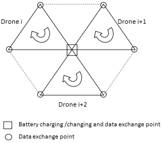 To cover a surface, a hexagonal cell comprising three operational equilateral triangles is considered (Figure 3). Each operational cell is covered by a UAV. All the UAVs that operate in the proposed network cells have a specific mission profile. In the middle of each cell, a battery charging/changing station is placed. Thus, in a hexagonal cell, three UAVs share the same battery charging/swapping dock.