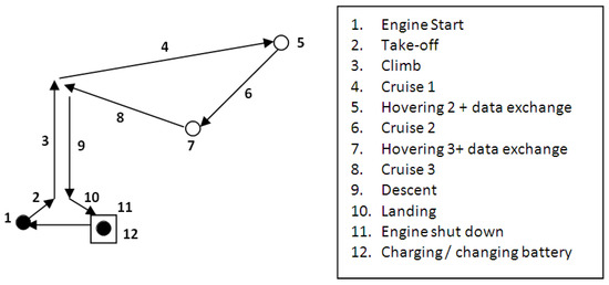 Each flight mission profile consists of several phases or steps. A general flight mission profile of the UAV consists of the following main steps: engine start, take-off, climb to the cruise altitude, cruise, hovering and data exchange, descent, landing, and engine shut-down. The next step consists of charging or swapping the UAV battery followed by a new flight mission. The triangular-shaped flight mission profile of the UAV contains three cruise segments (Figure 4). Each cruise segment is followed by hovering and data exchange steps.