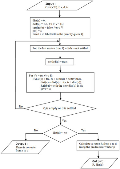 The Dijkstra algorithm is a method used to find the shortest path connecting two nodes in a network [43]. Our routing problem can be modeled using a time-dependent oriented network [44]. For the triangle drone network, an algorithm named TD-UAV Dijkstra (Figure 6) is proposed to find a route and its distance dist(d) in seconds from the source s to the destination d starting at the moment “ts”. In this network, the nodes (from the set denoted V) are the vertices of the triangles, and the arcs (from the set denoted E) are the connections between these points assured by drones. The length of each arc a = (u, v) is in seconds, is different in time, and depends on the arrival moments of the drone at node v. In the flowchart in Figure 6, f(a, t) denotes the moment of arrival at node v if node u is left at moment t on the arc a = (u, v). The arrival moments of drones for all arcs are pre-calculated (once before starting to use the algorithm) since an exact schedule for drones is known based on each drone’s starting second in a day, the travel on each arc, data transfer at nodes, and wireless charge/battery change time for each drone.