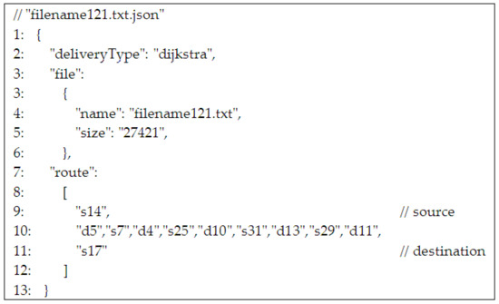 Delivery protocols of each file that has to be delivered were proposed. Thus, a “json” file is attached that keeps all the information needed to transfer the data file from the source to the destination: delivery type (Dijkstra, Spray and Wait, etc.), file information (name, size), and route information (node ids: stations and UAVs). A “json” file for a Dijkstra-type delivery of a data file named “filename121.txt” is shown in Figure 7. As a convention, in the above example, the stations are encoded starting with “s” followed by the numerical id of the station. Similarly, the UAVs are encoded with “d” followed by the numerical id of the UAV. Of course, each route starts and ends with a station id, each station id (except for destination) is followed by an UAV id, and after each UAV id, a station id is next.