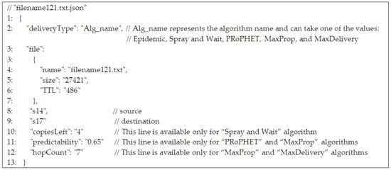 The json file that keeps information for the algorithms implemented in the ONE environment is presented in Figure 8.