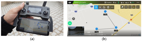 Usually, in practice, a minimum of 3–5 tests in the design of experiments are considered statistically relevant. Five preliminary flight tests were performed for the triangular-shaped flight mission in the Brasov area in Romania. The results of the flight tests were statistically analyzed, and the average values were used in the simulation of the UAV networks. Experimental flight times for each segment of the UAV flight mission were measured and used in the simulation of the UAV network. A Samsung S8 smartphone device with DJI Go 4 app software (DJI, Shenzhen, China) installed on it, connected to a DJI remote controller (Figure 9), was used to remotely control the UAV.