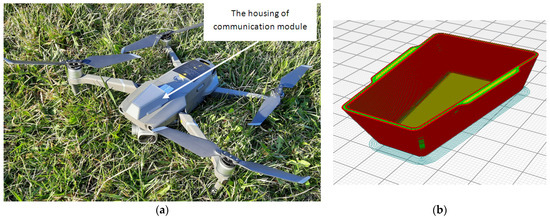 (a) DJI Mavic 2 Pro quadcopter with a communication drone-station module; (b) 3D model of the communication module case within the 3D printer software simulation.