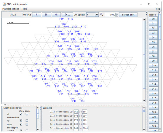 To validate the proposed method, simulations were performed using the UAV network maps as collections of hexagons. Most of the simulations were performed using the Java-based simulator ONE [54,55]. The routing protocols used for the simulation within the ONE simulator are Epidemic, Spray and Wait, PRoPHET, MaxProp, and MaxDelivery.