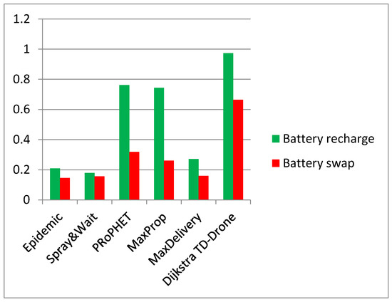 The delivery rate in the case of drone battery charge is between 0.135 and 0.143 for the routing protocols Epidemic, Spray and Wait, PRoPHET, MaxProp, and MaxDelivery. The maximum delivery rate is 0.664 and was obtained for the TD-UAV Dijkstra protocol. The worst results for latency were obtained for PRoPHET, and the TD-UAV Dijkstra latency was the best.