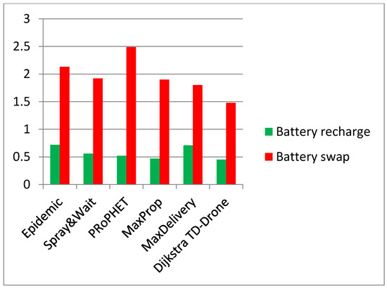 Two performance factors of the DTN UAV network were estimated: delivery rate and average latency. Detailed results of the comparison between battery charge and battery swapping are shown in Table 6. The values of the delivery rate in the case of drone battery swapping are in the range of 0.166 and 0.646 for the routing protocols Epidemic, Spray and Wait, PRoPHET, MaxProp, and MaxDelivery. The best delivery rate is an impressive 0.973 for the TD-UAV Dijkstra protocol (Figure 14). The worst results of latency were obtained for Epidemic, and the TD-UAV Dijkstra average latency was the best, as expected (Figure 15).