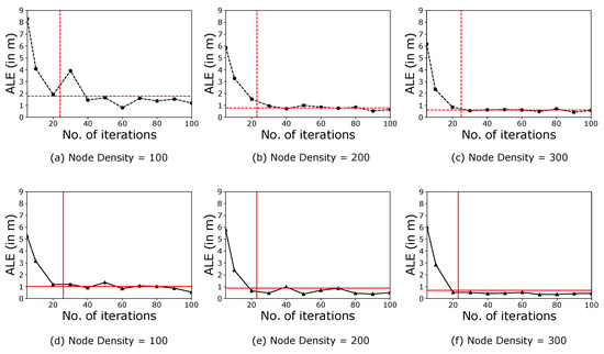 Variation of ALE with respect to the number of iterations for a transmission range of 15 m over a monitoring area of 100 m × 100 m.