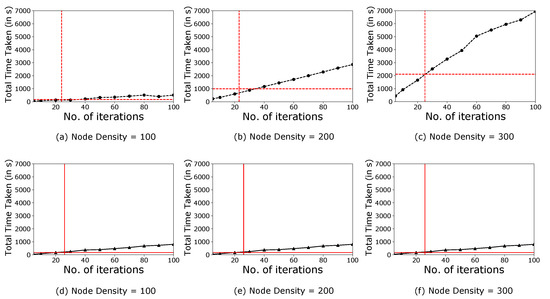 In Figure 5a–c, the dotted black line represents the variation of ALE with anchor ratio for modified CS algorithm. Similarly, the solid black line represents the variation of ALE with a anchor ratio for the modified CS algorithm (see Figure 5d–f). The intersection of the dotted red line represents the iteration number where the ECS algorithm exits the search process on the x-axis and the corresponding ALE on the y-axis for anchor ratio (see Figure 5a–c). Similarly, the intersection of solid red corresponds to anchor ratio (Figure 5d–f). When the search process starts for the node localisation, we found that both the algorithms begin with a random population of candidate solutions having spontaneous ALE, which is generally large due to the random nature of the estimated positions. As the number of iterations increase, the coordinates with the best fitness value in the iteration improve significantly. However, the ECS algorithm completes the node localisation task in a fewer number of iterations. Furthermore, we found that the ECS algorithm performs promisingly for anchor ratio, and hence it is practically feasible to use ECS compared to modified CS. Figure 6 follows the same representation as that of Figure 5. On comparing both the algorithms in terms of time taken, we found that the ECS algorithm performs way better than the modified CS algorithm for both 15% and 30% anchor ratio. Therefore, the proposed ECS algorithm is computationally efficient.