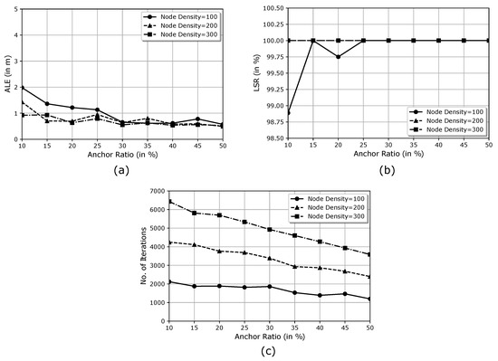 - ALEFigure 7a displays the variation effect of the anchor ratio on ALE. We found that the ALE decreases with an increase in the anchor ratio from to . However, the value of ALE does not vary much with the anchor ratio, as it remains between 0.5 m and 2 m. Furthermore, the value of ALE decreases as the node density increases. This decrease owes to the network connectivity getting better with the increase in population density of the nodes.