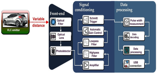 - Căilean, A.M.; Cagneau, B.; Chassagne, L.; Dimian, M.; Popa, V. Novel Receiver Sensor for Visible Light Communications in Automotive Applications. IEEE Sens. J. 2015, 15, 4632–4639. [Google Scholar] [CrossRef]