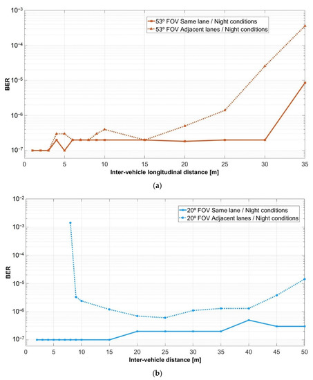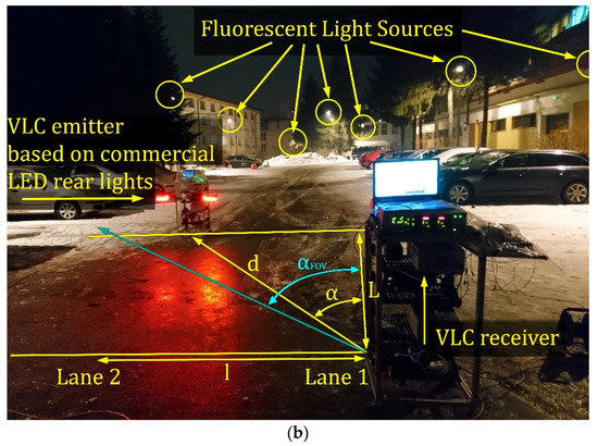 - Shen, W.; Tsai, H. Testing vehicle-to-vehicle visible light communications in real-world driving scenarios. In Proceedings of the 2017 IEEE Vehicular Networking Conference (VNC), Torino, Italy, 27–29 November 2017; pp. 187–194. [Google Scholar] [CrossRef]